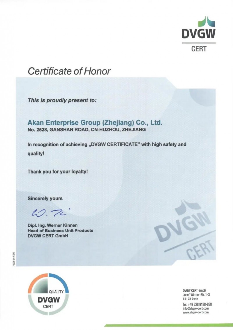DVGW認證是由德國燃氣與水工業(yè)協(xié)會(DVGW)設立的產(chǎn)品認證體系,需經(jīng)過第三方權威實驗室的機械性能檢測和衛(wèi)生測試等多重嚴格測試,在行業(yè)內(nèi)具有高度權威性。這份證書不僅是對雙方合作基礎的有力見證,更是對愛康企業(yè)集團技術實力的充分認可。